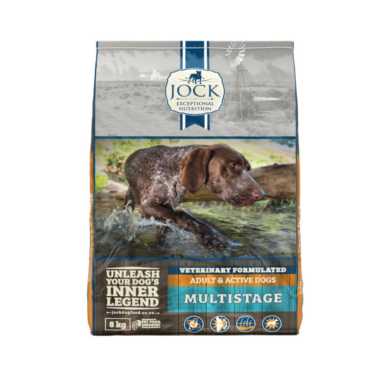 2JOCK MULTISTAGE Suitable for adult and active dogs JOCK Multistage is formulated to get active dogs’ tails wagging. Using only the finest, carefully selected ingredients, it provides a complete balanced nutritional diet, specifically geared towards the daily health of dogs with a zest for life.